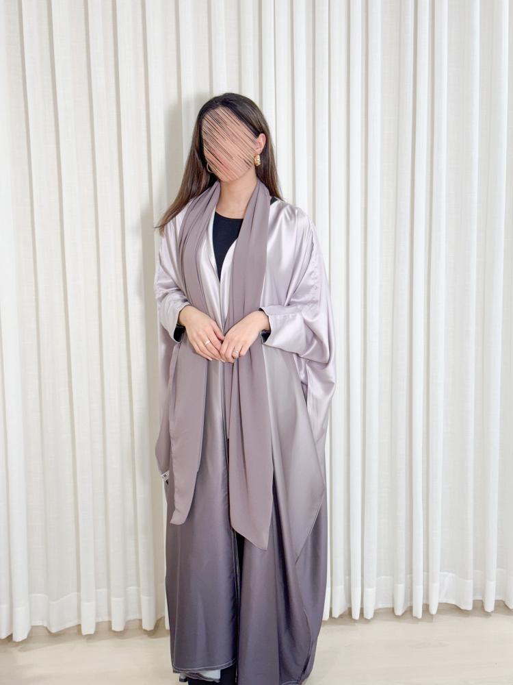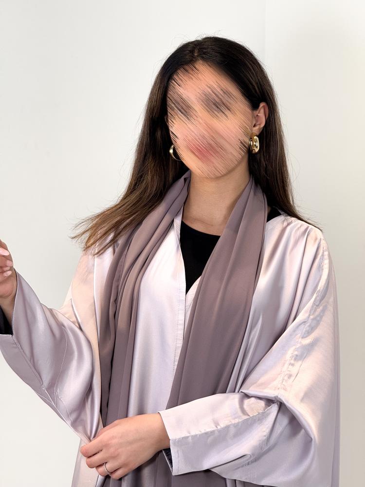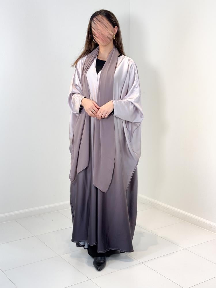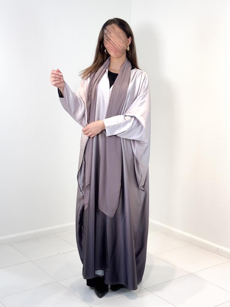 عباية أنيقة من قماش الحرير الأومبريه، تتميز بتدرجات الألوان الموف الفاتح والبنفسجي الغامق التي تنساب بشكل تدريجي وتمنح الإطلالة مظهراً ساحراً وراقياً. تأتي بقصة نص بشت تضفي على التصميم لمسة من الفخامة والتميّز، ما يجعلها خيارًا مثاليًا للمناسبات الخاصة والاحتفالات. خفيفة، انسيابية، وتبرز الأناقة بأسلوب عصري يجمع بين الألوان الهادئة والتصميم الفريد.