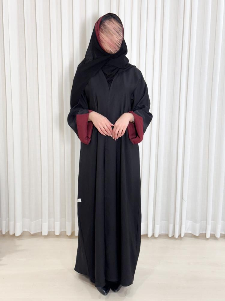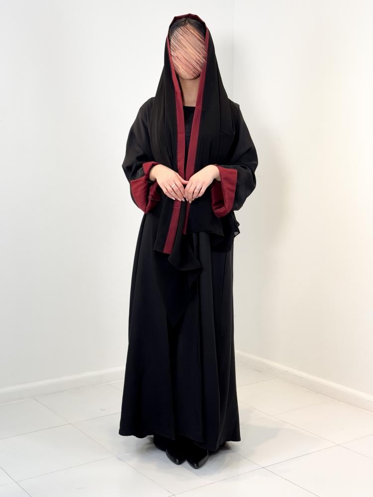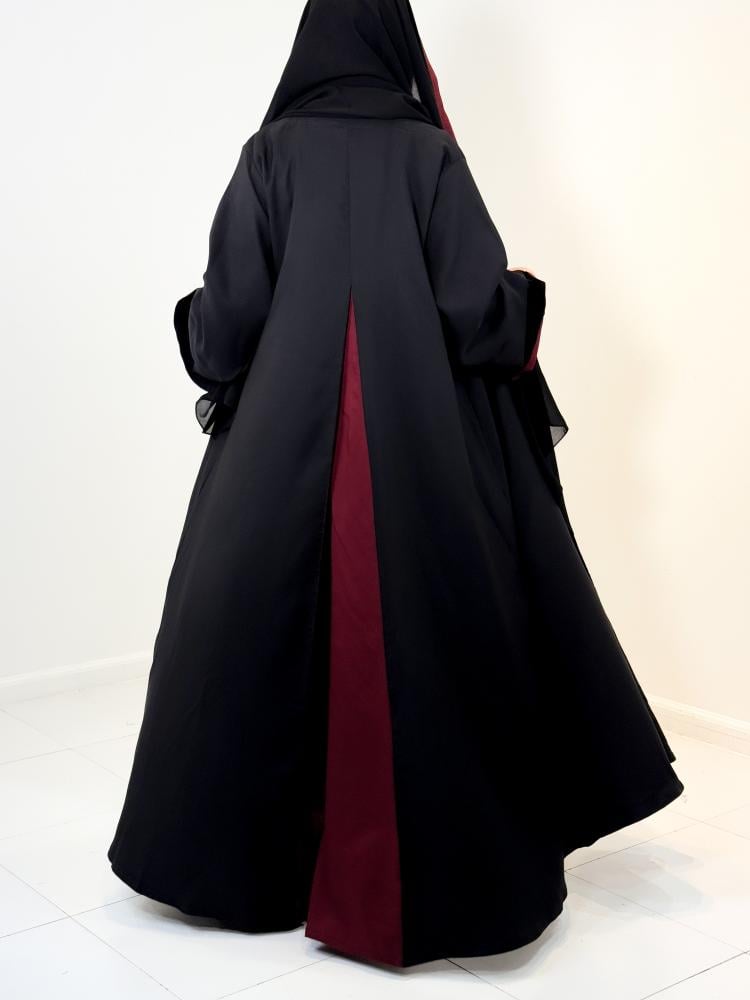 عباية كريب ملكي أسود بتصميم راقٍ يجمع بين الكلاسيكية واللمسات العصرية. تتميز بقصّة نص كلوش مع كسرة عنابية من الخلف تضيف عمقًا وأناقة للحركة. الأكمام قابلة للطي ومبطنة بلون عنابي لمظهر متجدد يناسب مختلف الإطلالات. 🖤✨